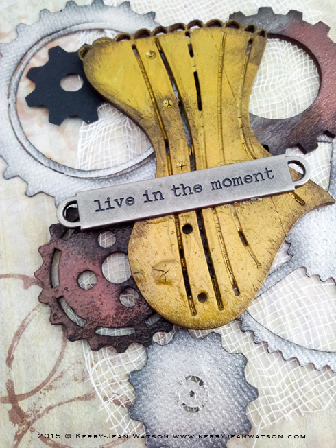 I used the cardmakers set for this card which, I feel, gives a good size to work with. The Kaisercraft bodice was coated in some antique bronze crackle paint and the gears in the background where given the old rust treatment. The one thing that I could not get to show up well on the photo was a layer of clear crackle I put down on the background before adding all the delicious elements.