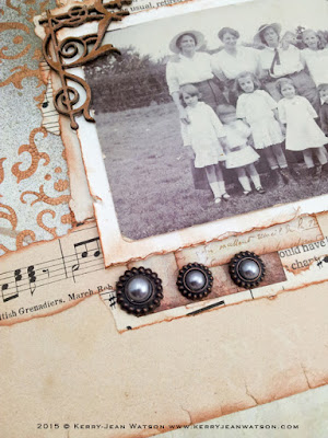 I have used old music sheets stacked behind the photo with a couple old book pages as well. The Donna Downey Studio Damask Stencil in the background was done using Prima's Finnibair Art Extra Vagance Texture Paste - Copper Crackle with a bit of misting over the top. I had a few scraps of the Cafe au lait cardmakers set on my desk which I turned in to tags and tuck them in behind the photo.