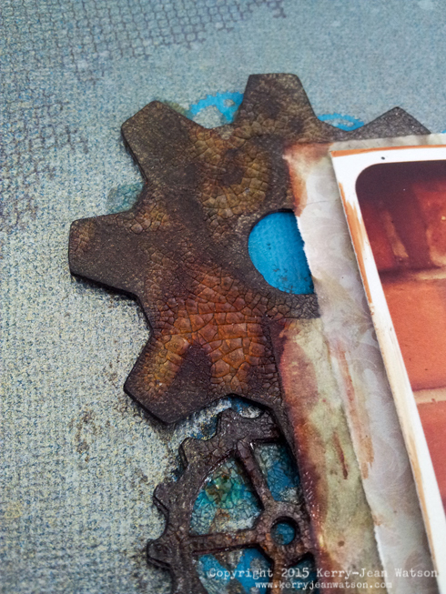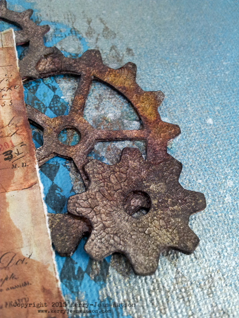 The cogs were cut out with my Silhouette Cameo and then stacked and glued to make them a bit more dimensional. They were then painted and stained and covered in Tim Holtz's rock candy crackle medium, which is so awesome.